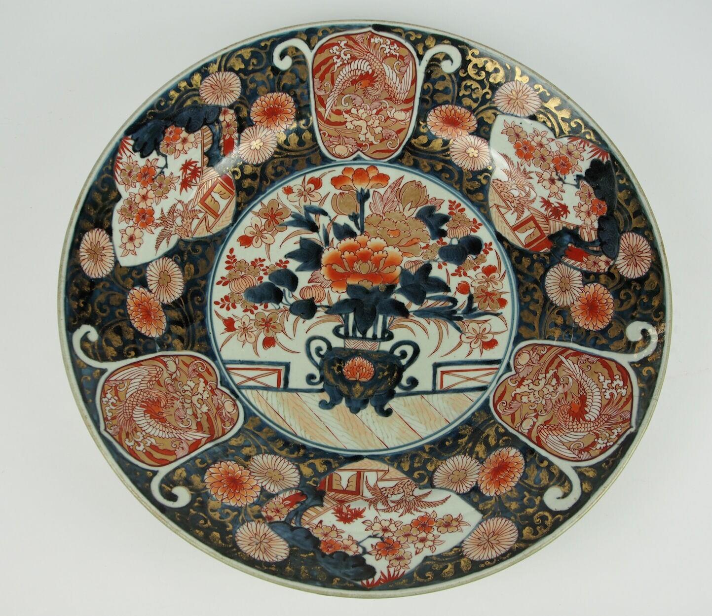 De schotel heeft een standring en een brede, schuin oplopende rand. Het plat heeft, binnen een dubbele cirkel, een decor van een veranda met hekjes en een vaas met bloemen. De vertreding en de rand zijn gedecoreerd met aster- en chrysantranken tegen een blauwe achtergrond, waartussen zich afwisselend lotus- en tulpvormige cartouches bevinden met daarin decors van een huis met een bloesemboom, respectievelijk een zogenoemde h?-?-vogel met een pioenroosrank. De buitenwand is gedecoreerd met een prunus-, een chrysant- en een pioenroostak. Een breuk in de rand. (Nederlands)