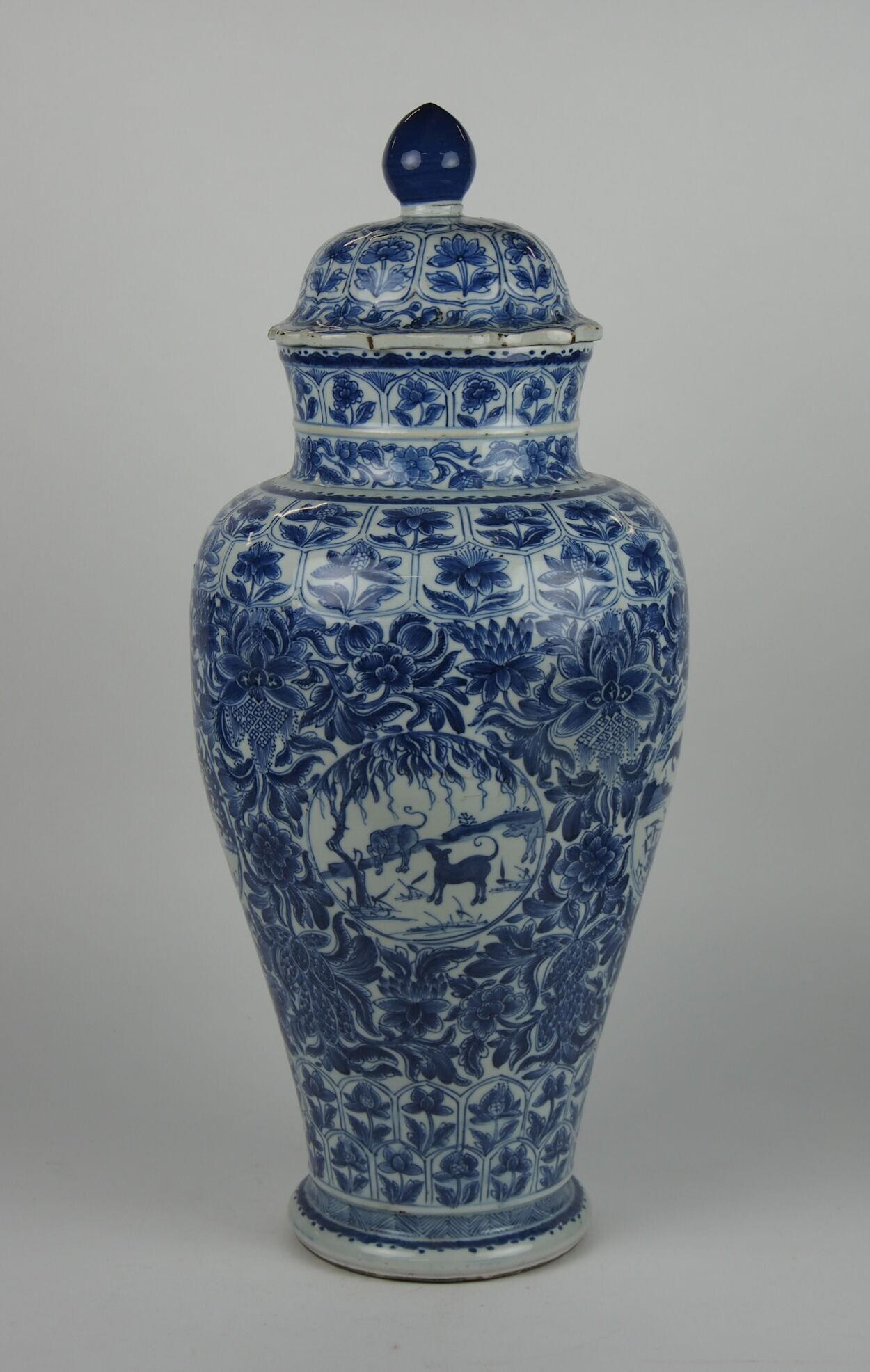 De vaas is balustervormig en heeft een conische voet met standring, een concaaf-cilindrische hals en licht gecontourneerde cartouches. De deksel is wijd klokvormig en heeft een geaccoleerde rand en een radijsvormige knop. De voet heeft een decor van lingzhi's. Boven de voet loopt een band met visgraatmotieven, waarboven zich twee banden met lotusbladvormige cartouches bevinden met daarin bloemen. De buik is rijk gedecoreerd met bloemen, waartussen vier ronde cartouches waarin landschapsdecors met respectievelijk drie herten onder een boom, vijf eenden bij een oever met riet, drie paarden onder een boom en drie hanen tussen bloeiende planten. De schouder heeft twee banden met lotusbladvormige cartouches waarin bloemen en een band met lingzhi's. Het deksel en de hals zijn gedecoreerd met elk een band met lotusbladvormige cartouches met daarin bloemen, waaronder zich een band met doorlopende floraalmotieven bevindt. Randschade deksel. Lichte beschadigingen voet. (Nederlands)