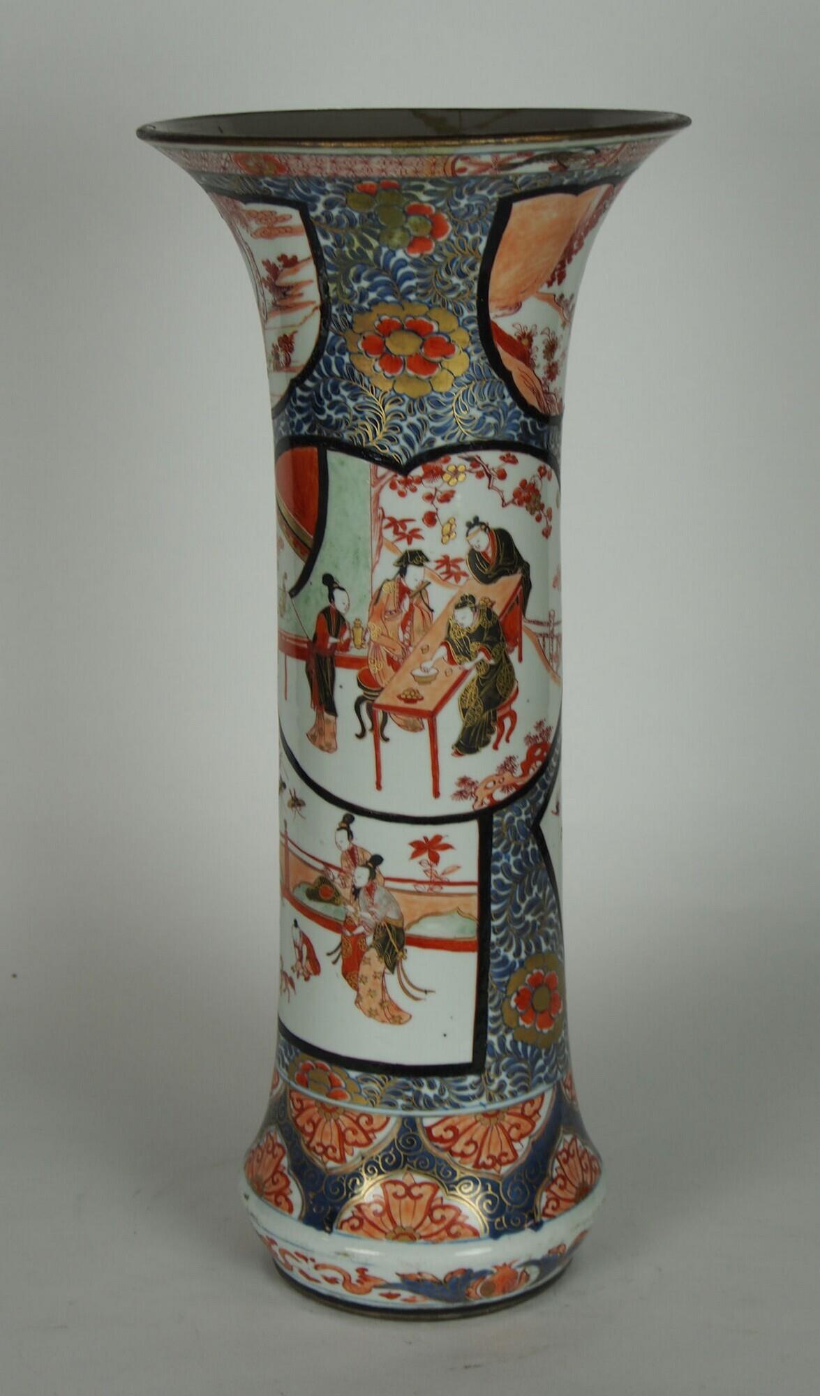 De vaas is concaaf-cilindrisch van vorm en heeft een conische voet met een standring. De voet heeft een decor van granaatappels tussen blad- en rankwerk. Boven de voet is een blauwe band met spriraalvormige versiering in bovenglazuur goud, waarin uitgespaarde half-bladvormige cartouches met gestileerde lotussen. De buik is gedecoreerd met spiralend rankwerk met bloemen, waartussen rechthoekige vakken en cartouches met verschillende vormen. Een rechthoekige cartouche toont een omheind terras met vliegende insecten, bloeiende planten, drie staande dames, en twee zogenoemde zotjes die met een hond spelen. Een waaiervormige cartouche verbeeldt een landschap met vliegende vogels, een treurwilg, een hekje, een staande dame en oude man. Een hartvormige cartouche heeft een decor van een terras bij een huis, met zon, een bloeiende prunusboom, begroeide rotsen, een grote tafel met bloemenvazen, twee smalle tafels met serviesgoed, twee staande en drie zittende figuren. Twee bloemvormige cartouches hebben een decor van een landschap met zon, wolken, rotsen, planten, een boom en een zittende figuur. Een smal vak toont een vogel in een prunusboom. Een langgerekt vak is gedecoreerd met een blo... (Nederlands)