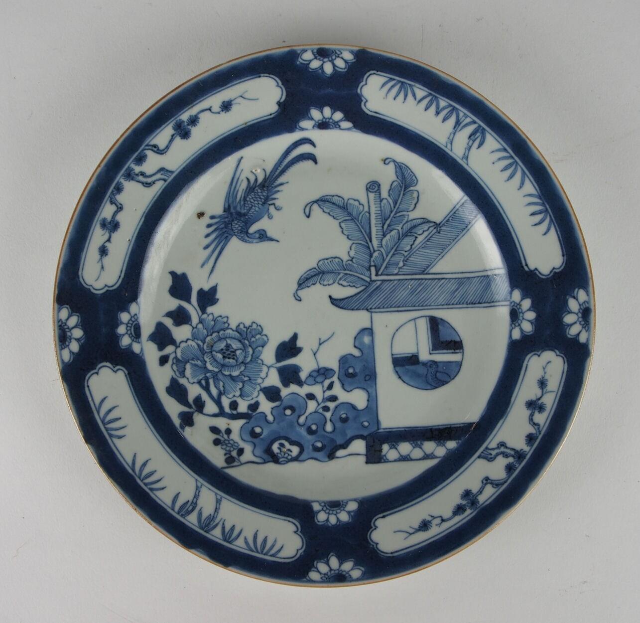 Het bord heeft een schuine standring en een brede, licht oplopende rand. Het plat heeft, omgeven door vier halve bloemen, een decor van een muur waarachter een vogel zichtbaar is, en een tuin met een rots, een bananenplant, een bloeiende pioenroosplant en een vliegende phoenix. Op de rand bevinden zich vier in het blauw uitgespaarde, langgerekte geschulpte cartouches met daarin afwisselend prunusranken en gras. Tegen de rand bevinden zich vier halve bloemen. (Nederlands)