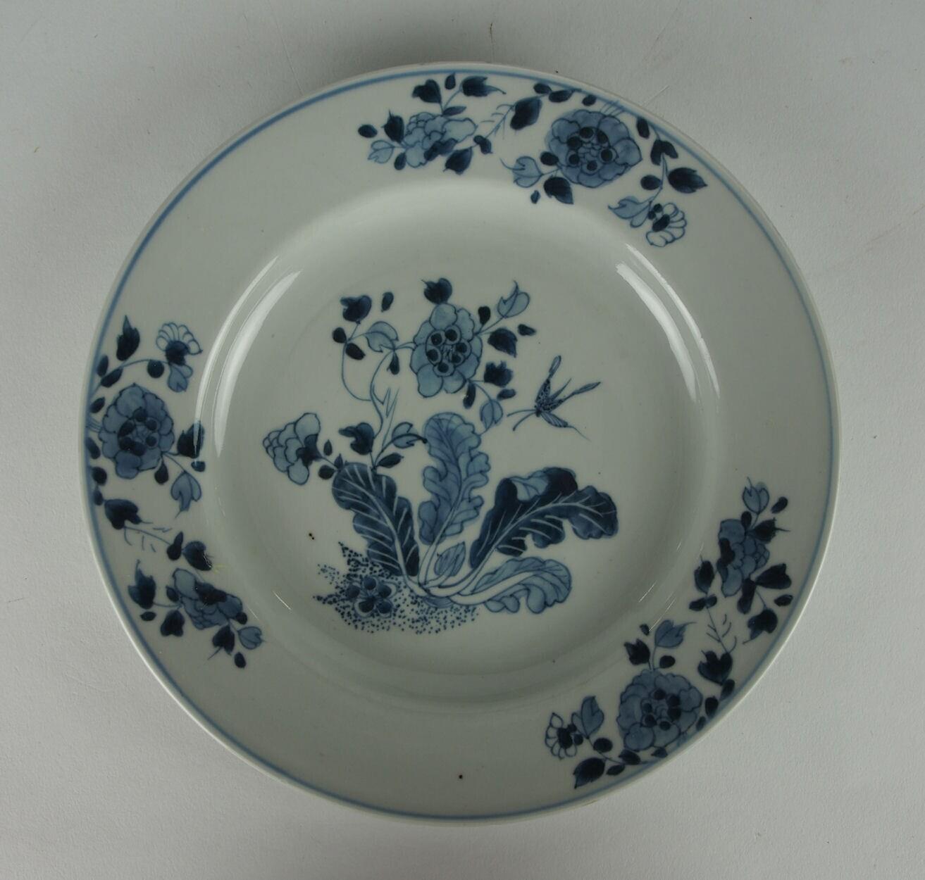 Het bord heeft een schuine standring en een brede, licht oplopende rand. Het plat heeft een centraal decor van een bloeiende plant met grote bladeren en een vliegend insect. De rand is gedecoreerd met drie bloesemtakken. (Nederlands)