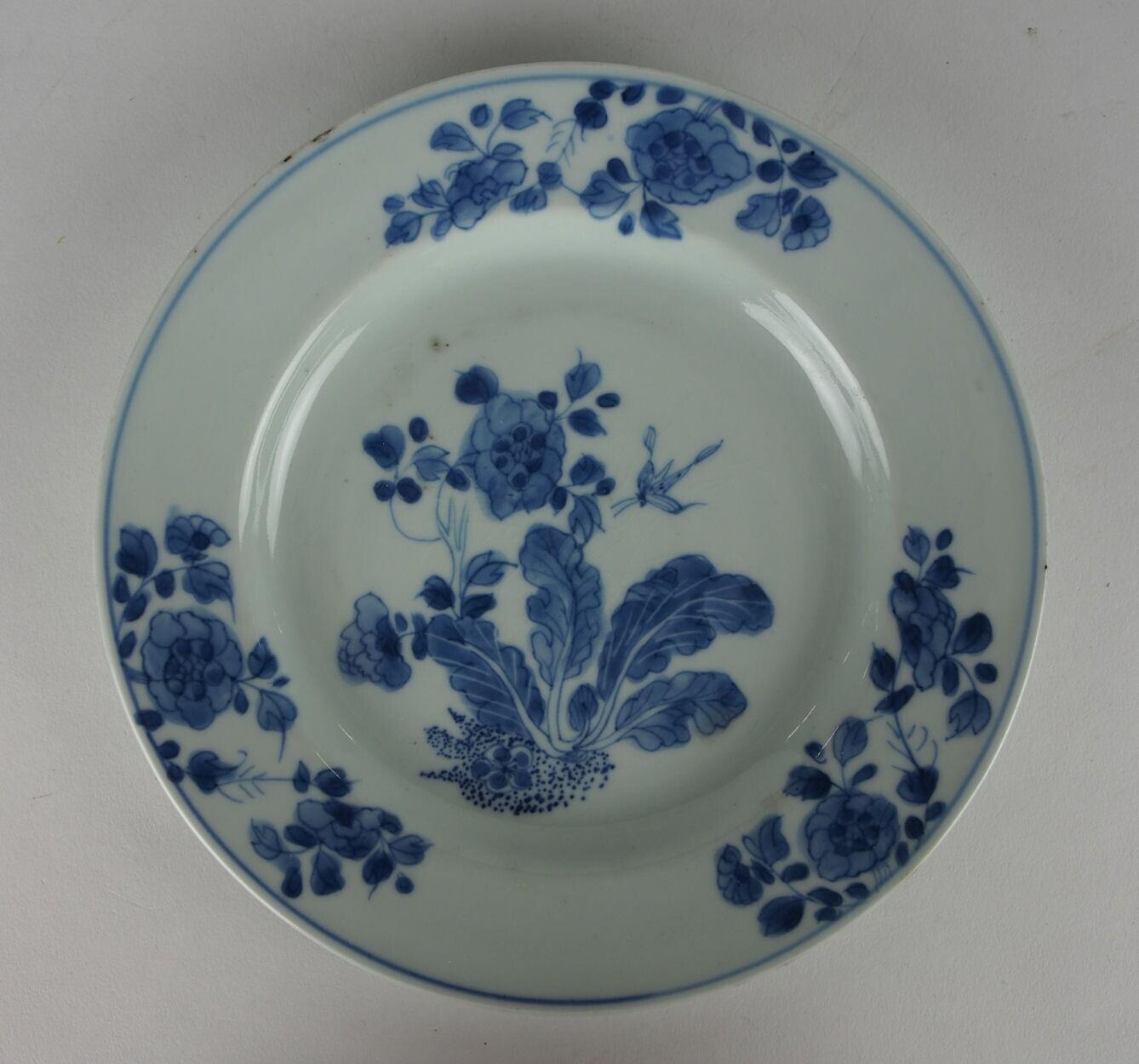 Het bord heeft een schuine standring en een brede, licht oplopende rand. Het plat heeft een centraal decor van een bloeiende plant met grote bladeren en een vliegend insect. De rand is gedecoreerd met drie bloesemtakken. (Nederlands)