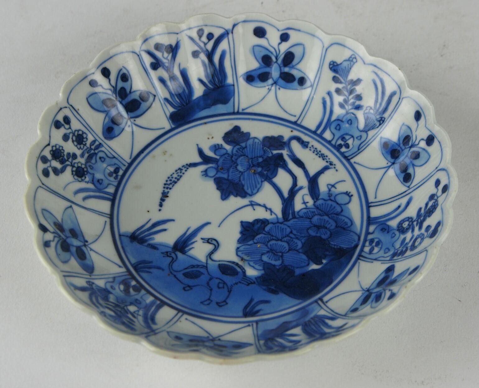Het schoteltje heeft een standring, een gelobde wand en een geschulpte rand. Het plat heeft, binnen een dubbele cirkel, een decor van een landschap met gras, een bloeiende pioenroosplant en twee ganzen. De wand heeft twaalf bloembladvormige cartouches met daarin afwisselend vlinders en bloeiende planten (bij rotsen). De buitenwand is gedecoreerd met drie bloesemranken. (Nederlands)
