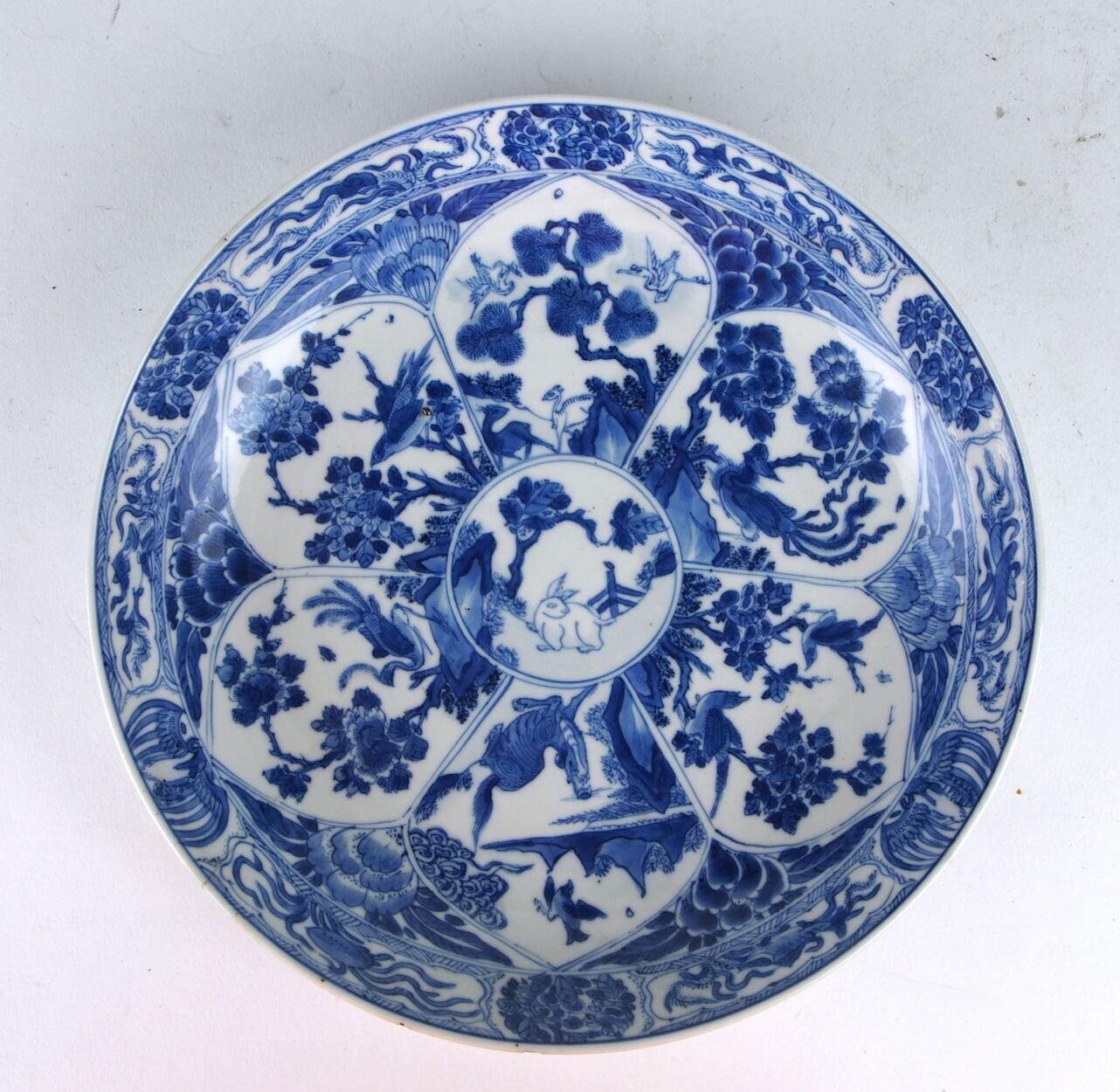 De schotel is gewelfd en heeft een standring. Het plat heeft, binnen een dubbele cirkel, een centraal decor van een landschap met een hekje, rotsen, een bloesemboom en een witte haas. Daaromheen bevindt zich een band met lotusbladvormige cartouches waarin decors van een rots met bloeiende plant en een phoenix of een of meer vogels. Een cartouche toont een rivierlanschap met bergen, rotsen, een vliegende vogel en ??. Tussen de cartouches bevinden zich bloemen met twee bladeren. De rand heeft een decor van rankwerk, waartussen zes ovale cartouches met afwisselend een phoenix en rankwerk?. (iets met vissen en lieveheerbeestjes?) De buitenwand heeft een decor van drie bloesemtakken. (Nederlands)