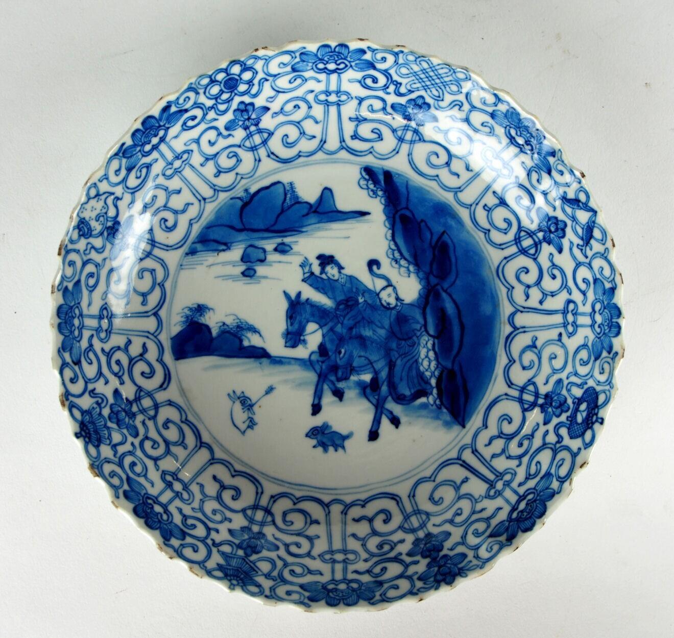 De schotel is gewelfd en heeft een standring, een gelobde wand en een geschulpte rand. Het plat heeft, binnen een dubbele cirkel, een decor van een landschap met bergen, rotsen, bomen, planten en een bewapende oosterse heer en dame te paard met een hondje, die een konijn of haas hebben aangeschoten met een pijl. Deze decoratie staat wel bekend als het 'Joosje te paard'-decor. De wand is gedecoreerd met rankwerk en bloemen. De buitenwand heeft een decor van bloemen op steel. Randschade. (Nederlands)