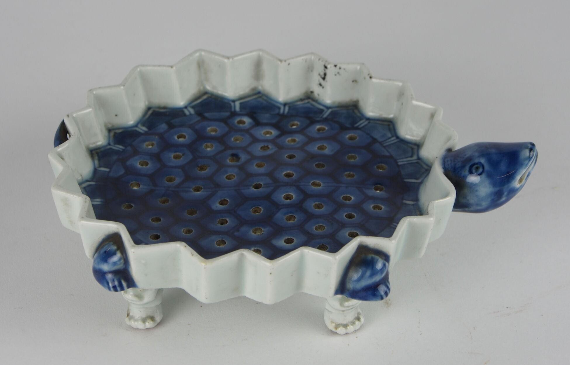 De fruittest heeft de vorm van een schildpad met geheven blauwe kop op vier poten. De platte, veelvuldig geperforeerde schaal heeft een gepunte, omgekeerd conische wand, waartegen zich de blauwe schouders van de poten bevinden. De poten hebben vier tenen, en de dijen zijn in de vorm van een monsterkop. Het plat heeft een decor van een centrale schildnaad en honingraatvormig servetwerk, omgeven door een rand van gepunte lotusbladen. (Nederlands)