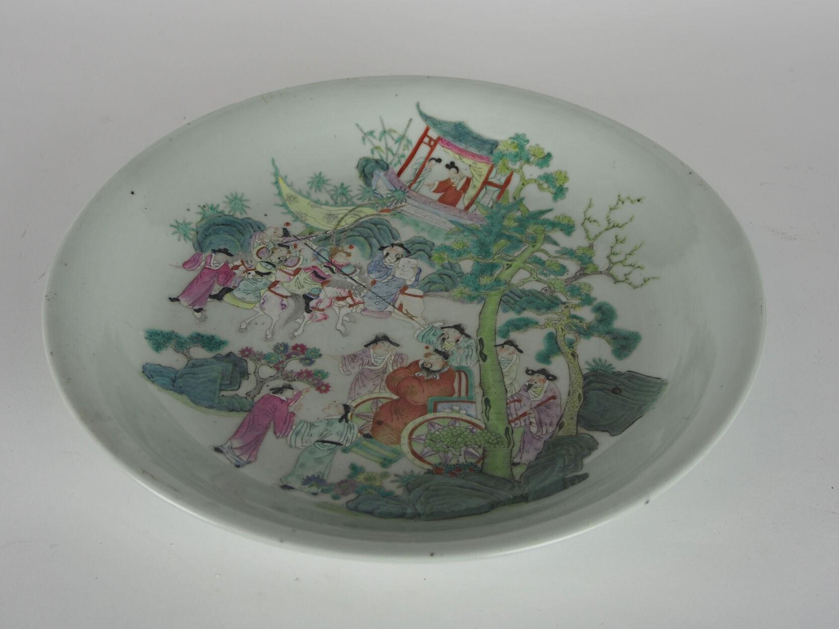 De gewelfde schotel heeft een standring en een rand met lip. De schotel heeft een decor van een landschap met bomen, rotsen met planten en een huis met dames voor het raam die kijken naar een oosterse heer in een verrijdbare zetel, die omgeven is door zes staande figuren, alsmede naar een gezelschap met gewapende ruiters te paard. (Nederlands)