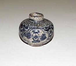 Het vaasje is bolvormig en heeft een rechte hals en een vlakke bodem. Het vaasje heeft decors van bloemen in bloemvormige cartouches tussen schubvormig servetwerk. De schouder is gedecoreerd met een spiraalsgewijs bloembladmotief. (Nederlands)