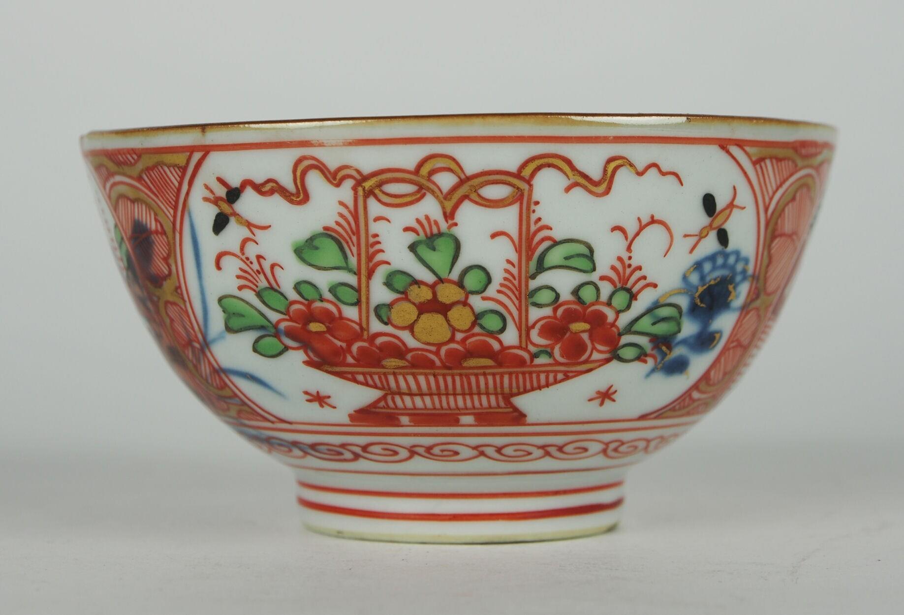 De met standring uitgevoerde kom is uitgevoerd met een bruine lip en voorzien van een blauwe onderglazuur decoratie bestaande uit bloemen en bomen. De later aangebrachte overglazuur decoratie bestaat uit cartouches die een bloemenmand toenen. Aan de binnenkant is in het plat een rivierlandschapje met een visser afgebeeld. Langs de bovenrand is een band met cartouches en gestileerde florale motieven geschilderd. De kom is convex-conisch van vorm en heeft een hoge standring. Het plat heeft een centraal decor van insecten rond een hengselmand met bloemen, een zogenoemd Hanakago-motief. Langs de rand loopt een band met servetwerk met daaronder een decor van rankwerk met afwisselend bloemvormige cartouches met servetwerk en gestileerde bloemen. De buitenwand heeft een onderglazuurdecor van bomen en bloemen, en een brede band met afwisselend grote en kleine ovale cartouches waartussen zich bladmotieven bevinden. De kleine cartouches hebben decors van een rivierlandschap met wolken, huizen, vliegende vogels en een visser. De grote cartouches hebben een Hanakago-decor. Boven de standring bevindt zich een band met spiraalvormig servetwerk. (Nederlands)