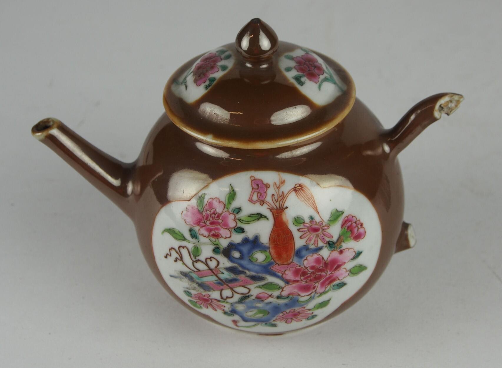 De theepot is bolvormig en heeft een standring, een korte hals, een rechte tuit en een ovaal oor. Het deksel is wijd klokvormig en heeft een radijsvormige knop. De theepot heeft twee in het kapucijner uitgespaarde bloemvormige cartouches met daarin decors van rotsen, pioenrozen, een vaas met bloemen en twee boekrollen. Het deksel heeft twee uitgespaarde bloemvormige cartouches met bloemen. Het oor is gebroken en los bijgevoegd. (Nederlands)
