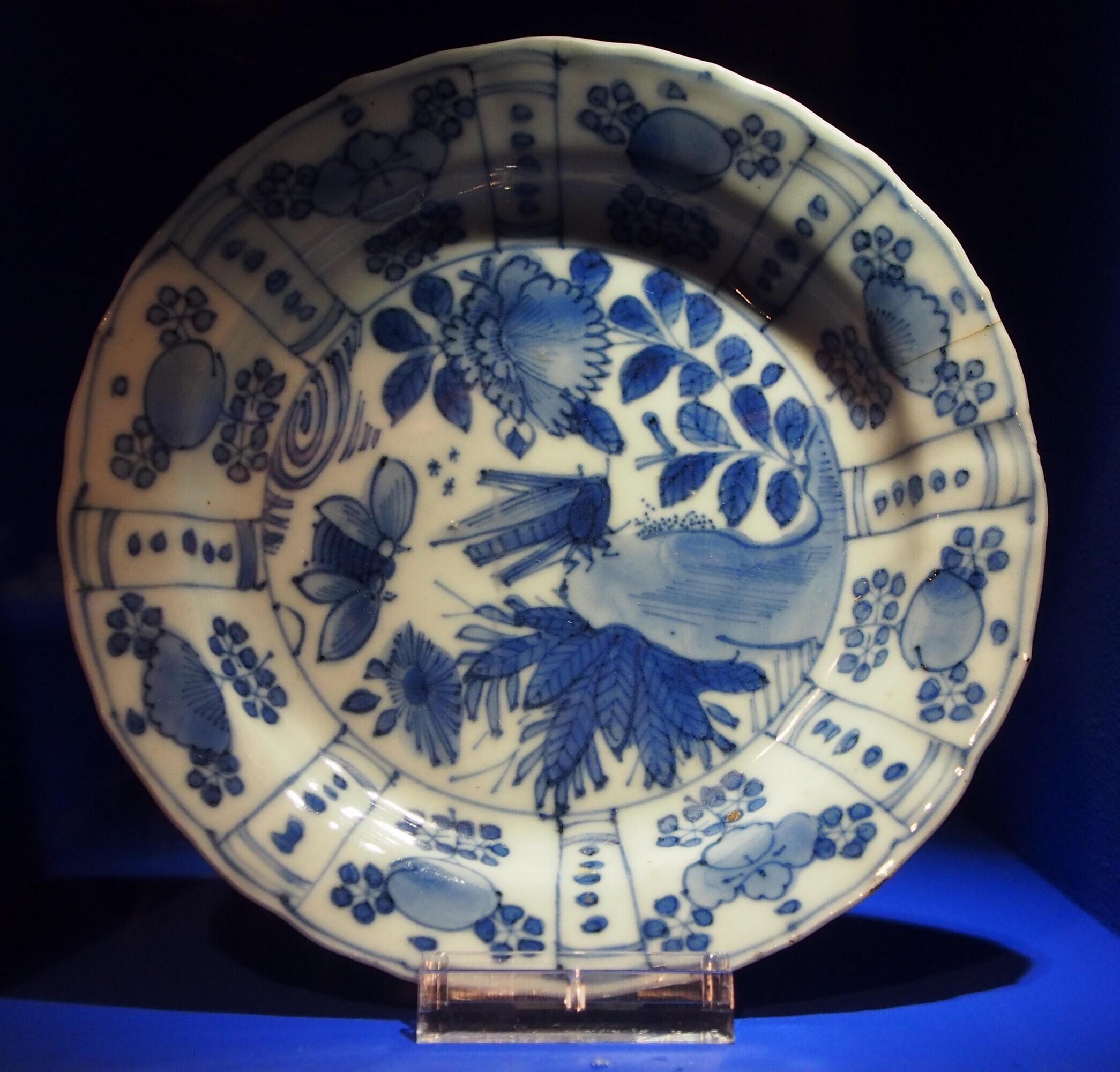 Deze schotel van kraakporselein heeft een standring en een schuin oplopende, licht geaccoleerde rand. De schotel heeft, binnen een enkele cirkel, een decor van een landschap met zon, wolken, een vlinder, bloeiende planten en een begroeide rots met daarop een sprinkhaan. (Nederlands)