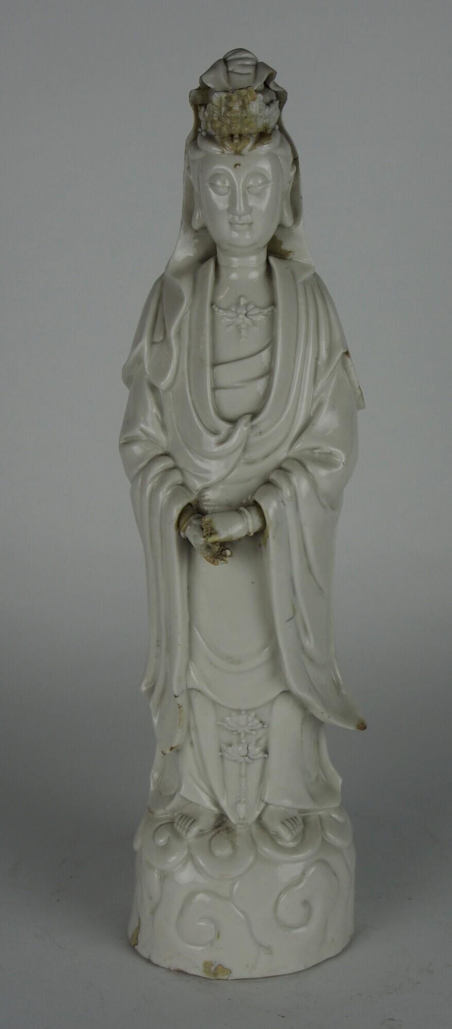 De blanc de Chine sculptuur verbeeldt een staande Guanyin op een rotsvormige sokkel. Gaunyin is gehuld in een lange, geplooide mantel met een hoofdkap, en draagt een kroon en op de borst vermoedelijk het juweel Cintamani. (Nederlands)