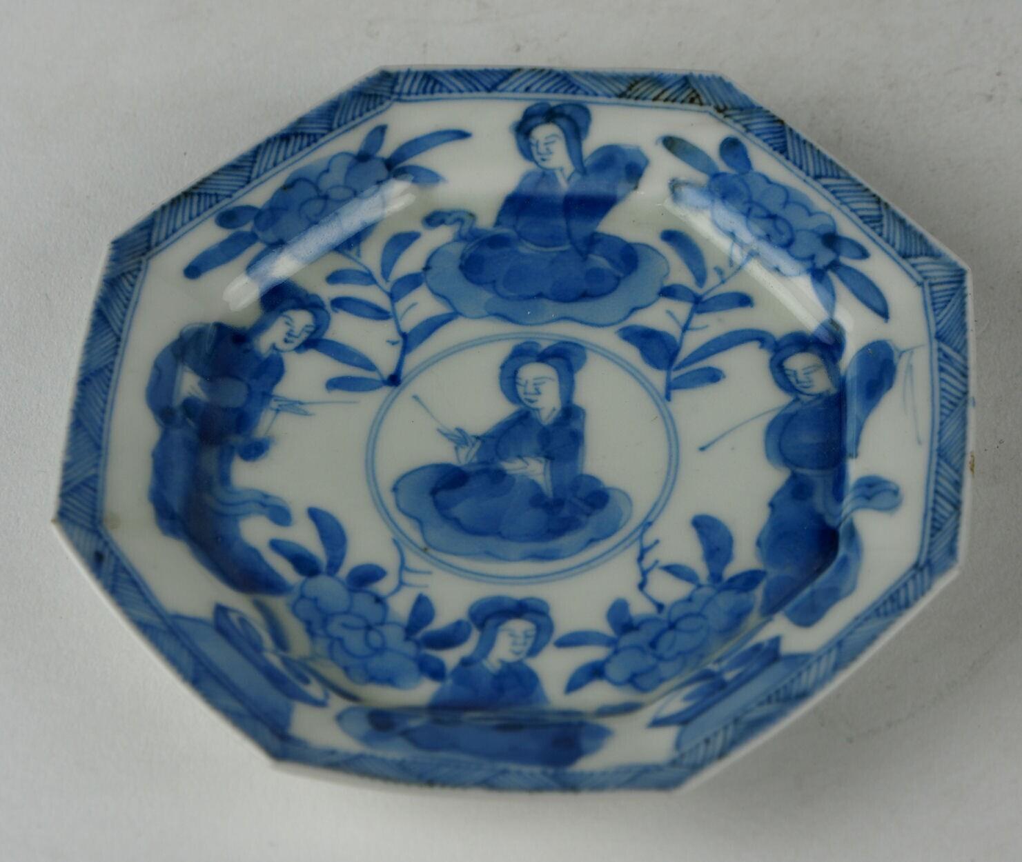 De octagonale schoteltjes hebben een hoge standring en een schuin oplopende rand. Het plat heeft, binnen een dubbele cirkel, een decor van een op een rond kussen gezeten oosterse dame. De wand is gedecoreerd met twee staande en twee zittende dames, waartussen twee bloemen en twee bloeiende potplanten. Langs de rand loopt een band met alternerend gearceerd driehoekig servetwerk. De buitenrand heeft een decor van twee bloesemranken. (Nederlands)