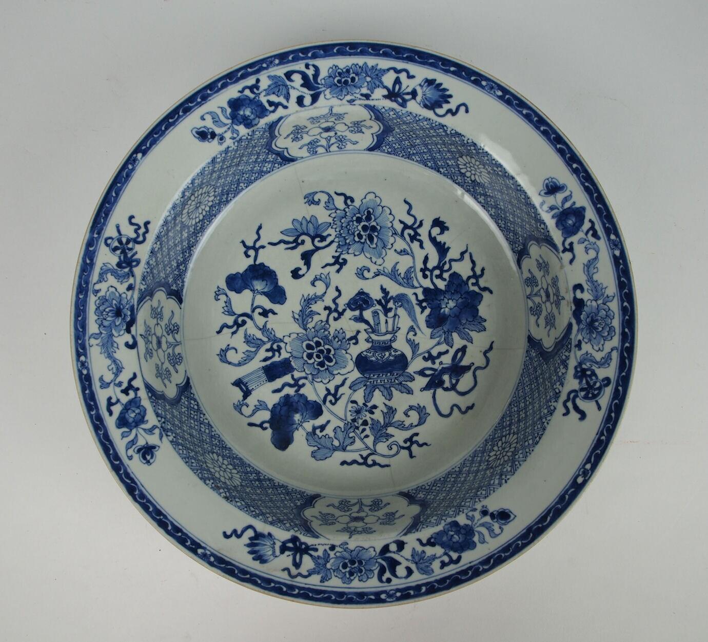 De diepe schotel heeft een standring en een brede, schuin oplopende rand. Het plat heeft een decor van bloemenranken, een boekrol? en een vaas waarin een ru-yi, een vliegenkwast en ?. Op de vertreding bevindt zich een band met ?vormig servetwerk, waarin vier bloemvormige cartouches met bloemen. De rand is gedecoreerd met vier bloemenranken en een band met ?vormig servetwerk. Barsten in het plat. (Nederlands)