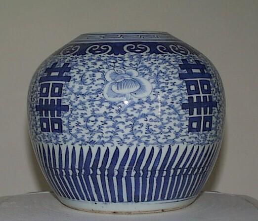 Gemberpot zonder deksel. Wit porselein met decor (onder meer bloemen en gekrulde ranken) in blauw onderglazuur. (Nederlands)
