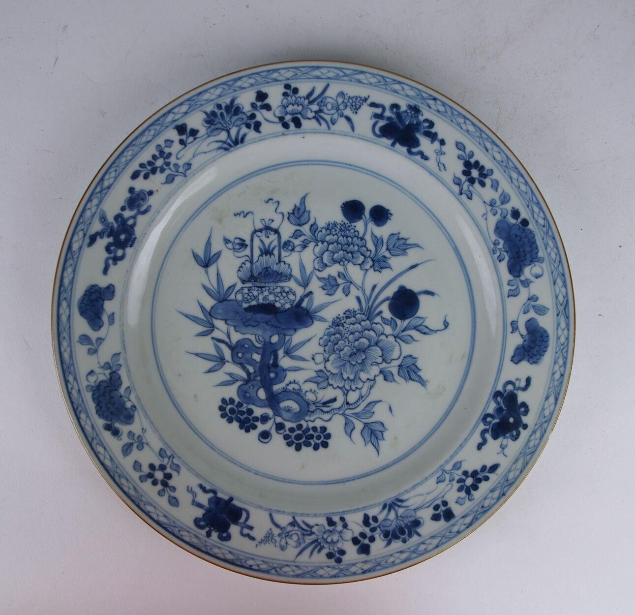 Het bord heeft een schuine standring en een brede, licht oplopende rand. Het plat heeft, binnen een dubbele cirkel, een decor van een bloemenmand op een rots en bloementakken, waaronder pioenroos. De rand heeft een decor van afwisselend bloesemtakken en kostbaarheden. Langs de rand loopt een band met bloemvormig servetwerk. De buitenrand heeft een decor van twee bloemenranken. Chip af aan de rand van de onderkant. (Nederlands)