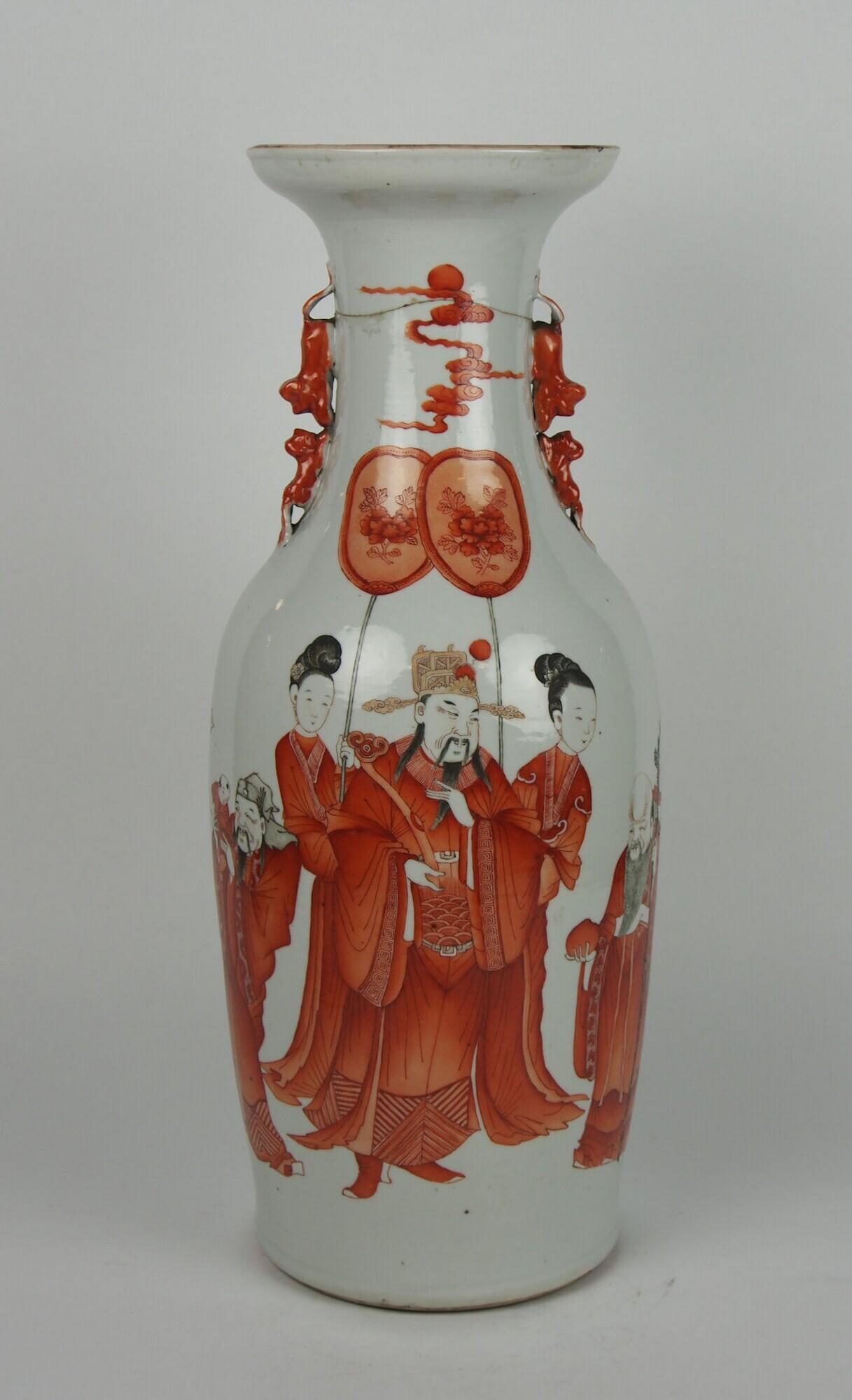 De vaas is slank eivormig en heeft een standring, een concaaf-cilindrische hals en een trompetvormige monding met een uitstaande rand. De hals heeft aan beide zijden applicaties van twee met de koppen naar elkaar gerichte, liggende leeuwen met brede staarten. De buik heeft een decor van staande oosterse hoogwaardigheidsbekleders, waarvan een met twee vrouwelijke dienaressen met waaiers waarboven gestileerde wolken, en vermoedelijk Shoulao, de Chinese god van het lange leven. Herstelde breuk aan hals. Chip afgebroken van rand. (Nederlands)