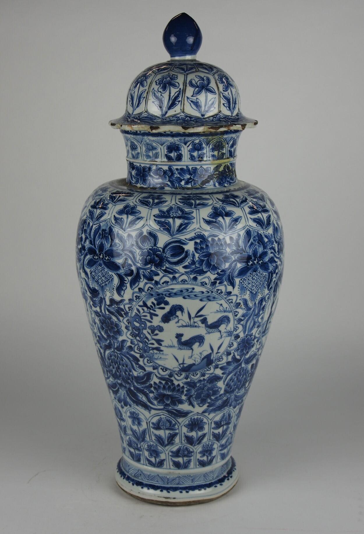 De vaas is balustervormig en heeft een conische voet met standring, een concaaf-cilindrische hals en licht gecontourneerde cartouches. De deksel is wijd klokvormig en heeft een geaccoleerde rand en een radijsvormige knop. De voet heeft een decor van lingzhi's. Boven de voet loopt een band met visgraatmotieven, waarboven zich twee banden met lotusbladvormige cartouches bevinden met daarin bloemen. De buik is rijk gedecoreerd met bloemen, waartussen vier ronde cartouches waarin landschapsdecors met respectievelijk drie herten onder een boom, vijf eenden bij een oever met riet, drie paarden onder een boom en drie hanen tussen bloeiende planten. De schouder heeft twee banden met lotusbladvormige cartouches waarin bloemen en een band met lingzhi's. Het deksel en de hals zijn gedecoreerd met elk een band met lotusbladvormige cartouches met daarin bloemen, waaronder zich een band met doorlopende floraalmotieven bevindt. Randschade deksel. Diverse herstelde breuken aan de hals en de buik van de vaas. (Nederlands)