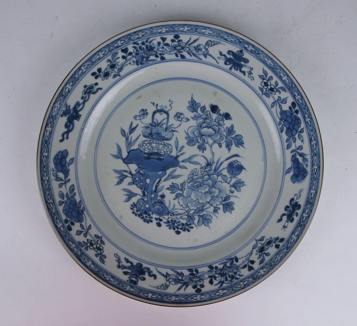 Het bord heeft een schuine standring en een brede, licht oplopende rand. Het plat heeft, binnen een dubbele cirkel, een decor van een bloemenmand op een rots en bloementakken, waaronder pioenroos. De rand heeft een decor van afwisselend bloesemtakken en kostbaarheden. Langs de rand loopt een band met bloemvormig servetwerk. De buitenrand heeft een decor van twee bloemenranken. Heel klein chipje af. (Nederlands)
