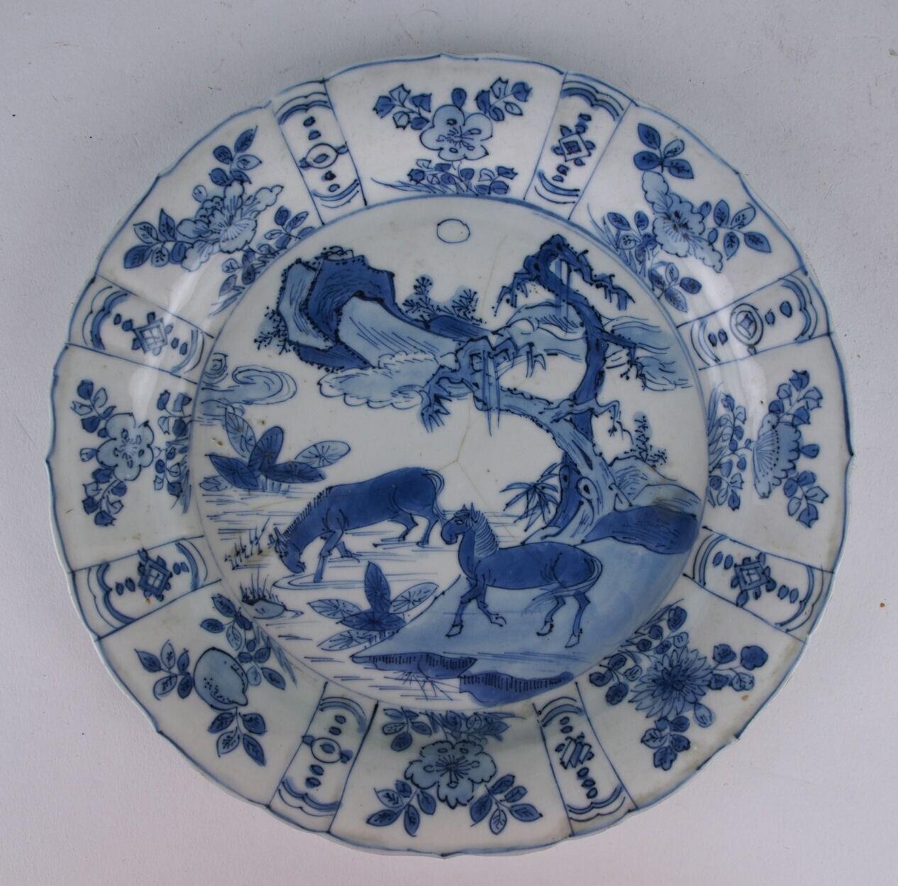 Het gecontourneerde kraakporseleinen bord heeft een standring en een brede, licht oplopende geaccoleerde rand. Het plat heeft, binnen een enkele cirkel, een decor van een rivierlandschap met de zon, bergen, bomen, waterplanten en twee paarden, waarvan er een door het water waadt. Op de rand en de vertreding bevinden zich acht brede vakken met bloesemtakken, waaronder perzik, en acht smalle kaders met daarin steeds twee parels aan weerszijden van afwisselend een ruit, een munt, een bloem of een parel. Op de buitenwand bevinden zich acht brede vakken met daarin afwisselend een parel, een ruit, een munt of een bloem omgeven door vier parels, en acht smalle kader met gestileerde lingzhi's. Enkele barsten en wat randschade. (Nederlands)