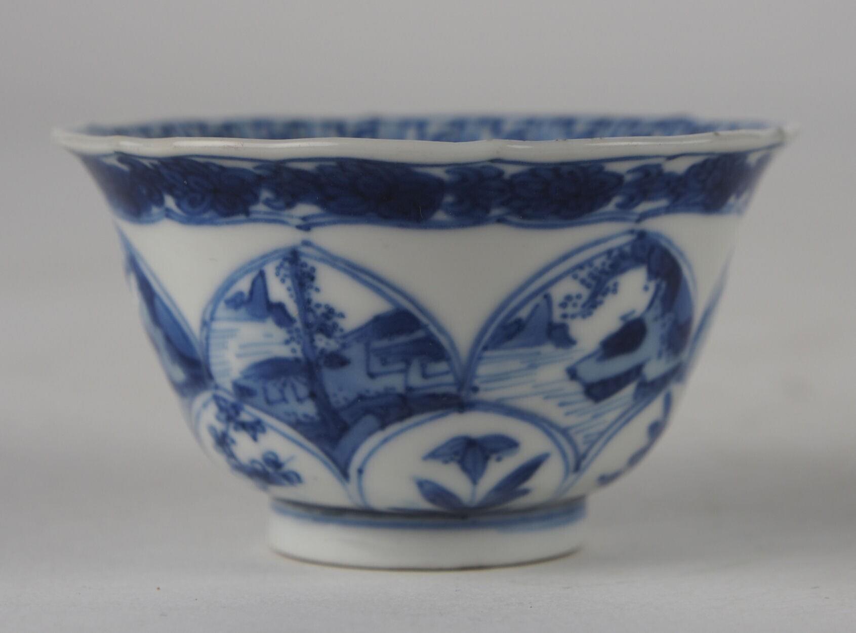 De schotel heeft een gecontourneerde wand, een schuin oplopende, geaccoleerde rand een standring. De theekom is omgekeerd wijd klokvormig en heeft een gecontourneerde wand, een licht geschulpte rand en een standring. De schotel en het plat van de kom hebben een erotisch decor van een landschap met bloeiende planten, een treurwilg warover een kledingstuk hangt, en een deels ontkleed oosters paar waarvan de man op een kleedje ligt. Deze scène staat wel bekend als 'de acupuncturist'. Het schoteltje heeft rond de centrale voorstelling een rand met nagelvormige vakken. Langs de binnenranden van de schoteltje en de kom lopen banden met swastikavormig servetwerk. De buitenwand van de schotel heeft boven de standring een band met vakken met floraalmotieven, waarboven een band met bloemenranken. De buitenwand van de kom heeft boven de standring een band met ronde cartouches waarin bloemen, waarboven zich een band met landschapsdecors bevindt. Langs de rand loopt een band met floraalmotieven. (Nederlands)