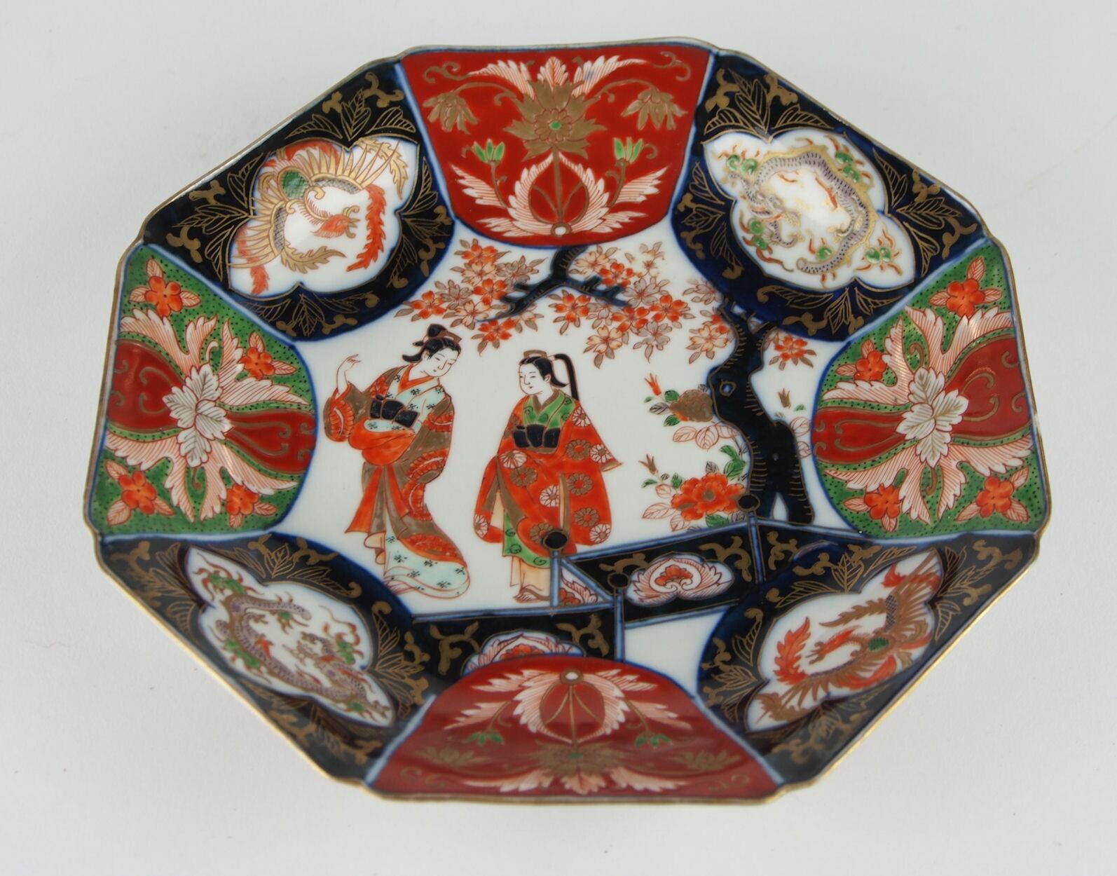 De octagonale schotel is gewelfd en heeft een standring en een schuin oplopende, geschulpte rand. Het plat heeft, in een stervormige uitsparing, een decor van een tuin met een hek met bloemdecoratie en twee staande oosterse dames onder een bloesemboom. Op de wand bevinden zich acht tulpvormige cartouches waarvan vier met een decor van bloemen, en vier met door rankwerk omgeven lotusvormige cartouches waarin zich afwisselend een draak en een zogenoemde h?-?-vogel bevinden. De buitenwand is gedecoreerd met spiralend rankwerk met vier rode en vier blauwe cartouches met daarin afwisselend een draak en een bloem. (Nederlands)