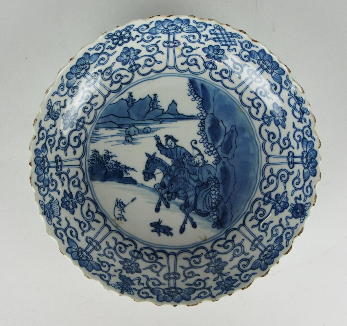 De schotel is gewelfd en heeft een standring, een gelobde wand en een geschulpte rand. Het plat heeft, binnen een dubbele cirkel, een decor van een landschap met bergen, rotsen, bomen, planten en een bewapende oosterse heer en dame te paard met een hondje, die een konijn of haas hebben aangeschoten met een pijl. Deze decoratie staat wel bekend als het 'Joosje te paard'-decor. De wand is gedecoreerd met rankwerk en bloemen. De buitenwand heeft een decor van bloemen op steel. Randschade. (Nederlands)