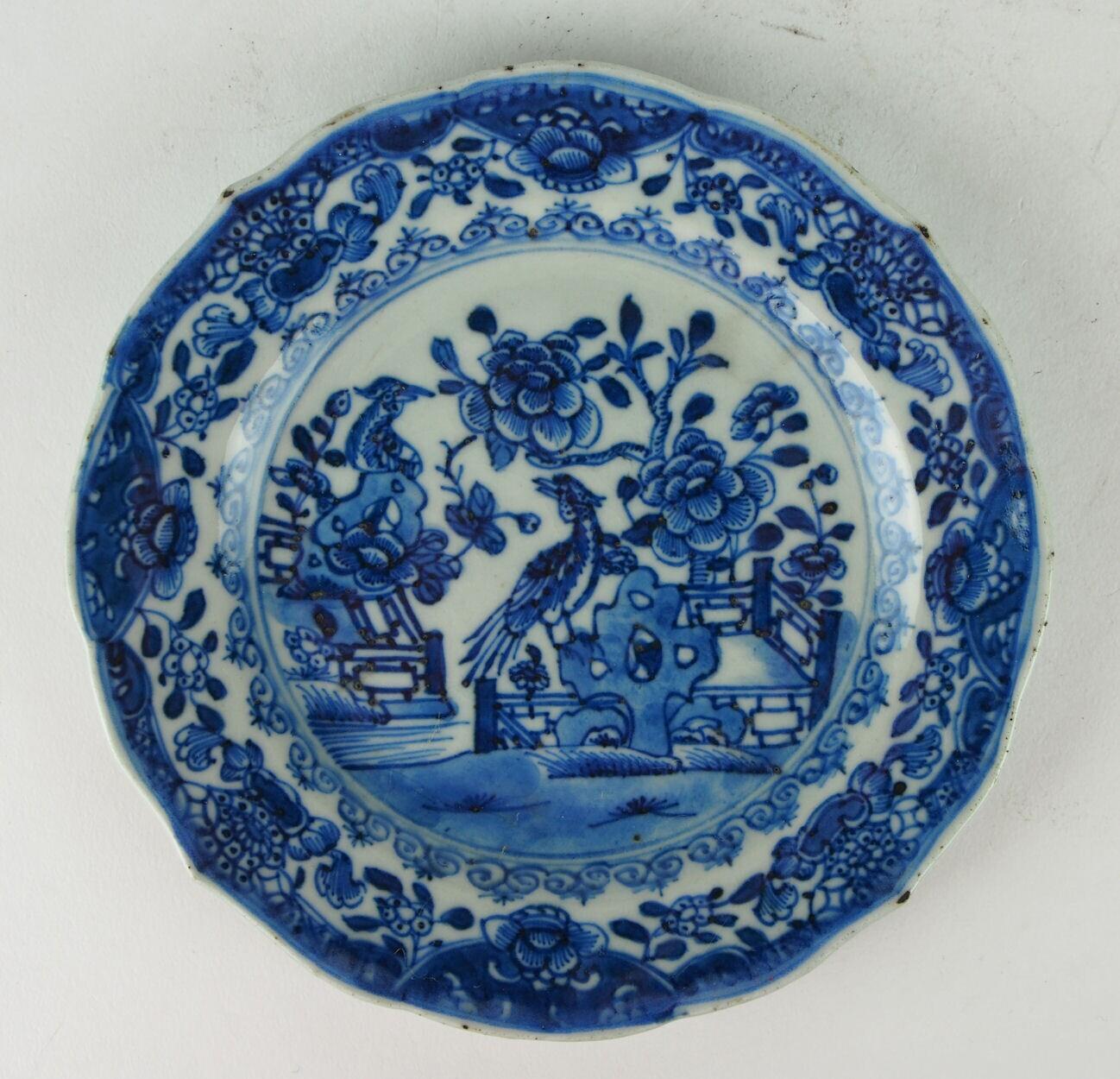Het bord heeft een schuine standring en een brede, schuin oplopende, licht geaccoleerde rand. Het plat heeft, binnen een enkele cirkel, een decor van een landschap met bloeiende planten, twee met hekjes omheinde percelen, en twee rotsen met op elk een vogel. Rond het centrale decor bevindt zich een doorlopende bloemenrank. Langs de rand loopt een band met een decor van rotsen, munten en floraalmotieven. De buitenwand is gedecoreerd met drie bloesemtakken. (Nederlands)