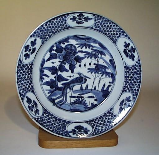 De schotel heeft een brede, schuin oplopende rand en een standring. Het plat heeft binnen een dubbele cirkel een decor van een landschap met pioenroos, bamboe, wolken, vliegende vogels en een grote vogel, vermoedelijk een phoenix. De rand is gedecoreerd met schubvormig servetwerk waarin zich zes ovale cartouches met bloemen bevinden. (Nederlands)