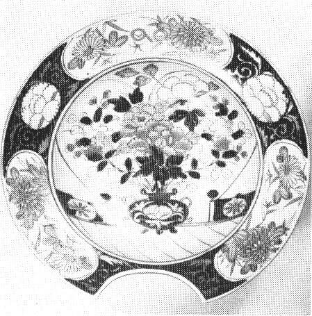 Zogenaamd Imari-porselein. Decor in blauw onderglazuur; 2 kleuren ijzerrood en goud opglazuur. Floralistische randversieringen en als centrum sierpot met bloemen. (Nederlands)