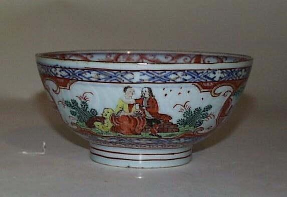 De kom is gedrukt half-ellipsoïdisch van vorm en een standring. Het plat heeft, binnen een dubbele cirkel, een decor van insecten rond een hengselmand met bloemen, een zogenoemd Hanakago-decor. De wand heeft vier decors van een vrucht met blaadjes. De rand is gedecoreerd met rankwerk met afwisselend bloemvormige cartouches met servetwerk en gestileerde bloemen. De buitenwand is versierd met een brede band met twee bloemvormige cartouches met decors van een rivierlandschap met een huis met torentje, bomen en een visser, en twee grote cartouches. De ene grote cartouche heeft een decor van een Hollands paar op een bankje tussen planten aan de waterkant. De andere grote cartouche omvat een decor van een Hollandse fruitplukker met een hoed en een mand op een ladder tegen een appelboom bij de waterkant. Boven en onder de band met cartouches bevinden zich twee banden met swastikavormig servetwerk. Boven de standring loopt een band met spiraalvormig servetwerk. (Nederlands)
