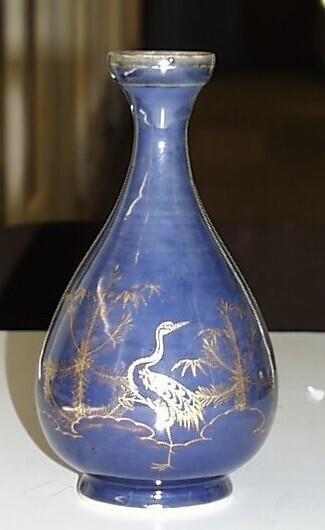 Decor o.a. kraanvogels in goud opglazuur. (Nederlands)