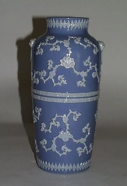 Navolging Wedgwood steengoed. Licht grijzig blauw porselein of porseleinachtig steengoed en ( wit) reliëfdecor in appliektechniek. Glazuur blauwig grijs. (Nederlands)