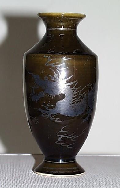Lichtgeel hard gebakken aardewerk, inwendig met geel, uitwendig met donker bruinig groen glazuur en regenboogkleurige weerschijn. Een draak in dun laagje zilver als decor. (Nederlands)