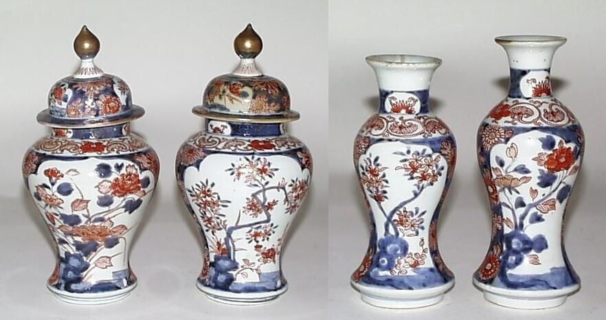 Kastgarnituur, bestaande uit: 2 vazen en 3 gedekselde potvazen. Floralistisch decor in blauw onderglazuur, ijzerrood en goud opglazuur. (Nederlands)