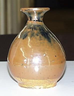 Licht grijzig geel steengoed. Bodem en voetring spaarzaam met bruin glazuur. Overigens koffiebruin glazuur met ingevloeid donkerblauw. (Nederlands)