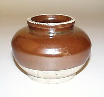 Licht grijzig geel steengoed. Onderkant en halsrand ongeglazuurd. Overigens kapucijnerbruin glazuur. (Nederlands)