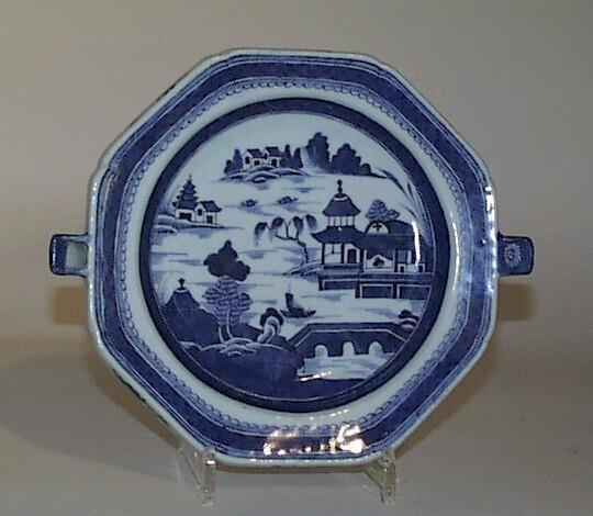 Het dubbelwandige bord is octagonaal van vorm en heeft een standring en twee knoppen waarvan er een als gietgat fungeert; een zogenoemd warmwaterbord. Het plat heeft, binnen een vette cirkel, een decor van een rivierlandschap met rotsen, bomen, huizen, pagodes, een prieel, boten en een brug. De rand is gedecoreerd met een smalle band, waarbinnen zich respectievelijk een brede, vette band en een smalle band met cirkeltjes bevinden. (Nederlands)