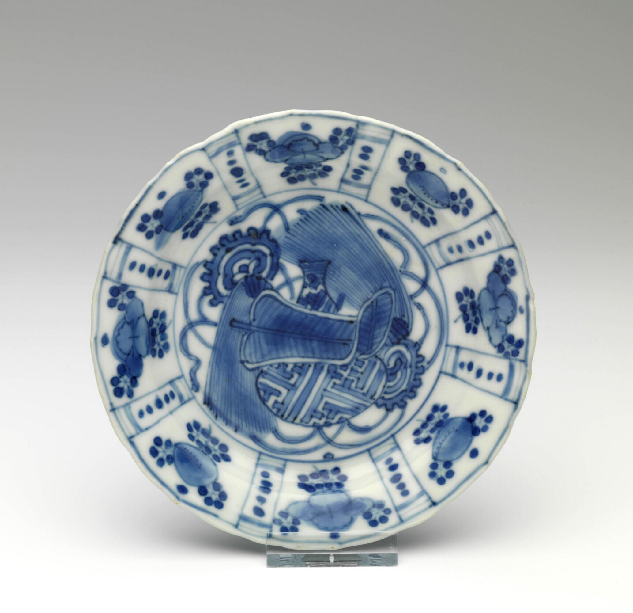 Het bordje heeft een brede, schuin oplopende, licht geaccoleerde rand en een standring. Het plat heeft, binnen een enkele cirkel, een decor van o.a. een palmblad, een flesje, ru-yi-koppen, kwasten en linten. De rand is versierd met acht bladvormige cartouches met afwisselende decors van bloemen en perzikbloesem. Tussen de bladvormige cartouches bevinden zich smalle panelen met vijf parels. De buitenwand is gedecoreerd met acht cartouches met elk vijf parels, waartussen zich smalle panelen met gestileerde lingzhi's bevinden./ Small plate wiht a palm leaf, a small bottle, ruyi -cloud-like motif-, brushes and ribbons. (Nederlands)