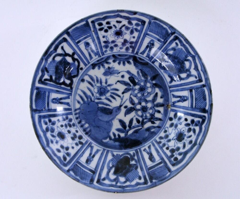 Japans porselein met een decor van het Chinese kraakporselein. Op het plat is een vogel op een rots met bloemen en planten. Het randdecor bestaat uit panelen die gevuld zijn met gelukssymbolen. (Nederlands)