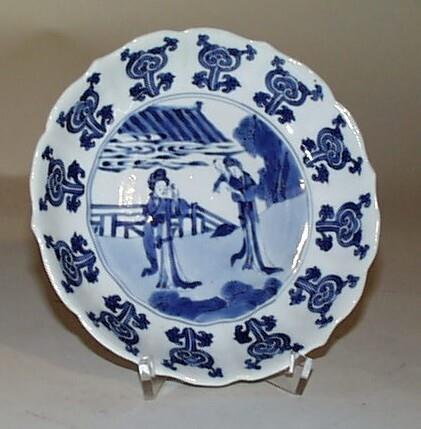 Het schoteltje heeft een gecontourneerde wand, een geaccoleerde rand met lip en een standring. Het plat heeft een decor van een landschap met wolken, een dak, een hek, begroeide rotsen, bloemen en twee dames, zogenoemde 'lange Lijzen', waarvan een met een kind op de arm. De rand is gedecoreerd met ru-yi-'s. De buitenwand is versierd met identieke bloemen. (Nederlands)