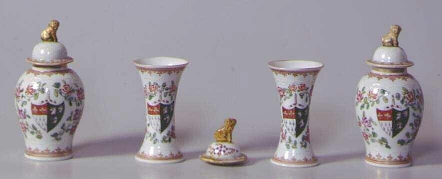 Twee vazen zijn eivormig en hebben een concaaf-conische voet met standring, een rechte hals, en een gewelfd deksel met een verdikte rand en een knop in de vorm van een boeddhistische leeuw. Twee vazen zijn concaaf-cilindrisch van vorm en hebben een standring. De eivormige vazen hebben op de voet en de schouder een band met pijlpuntversiering. De buik is gedecoreerd met aan de ene zijde het zogenoemde 'alliantiewapen met het handje', en aan de andere zijde met bloementakken. Beide decors zijn omgeven door witte foluten waarboven bamboe in reliëf; tussen de foluten bevinden zich bloemenranken. De deksels hebben decors van een bloementak en bamboe in reliëf, en op de verdikte rand een band met pijlpuntversiering. De bekervazen hebben op de voet en langs de monding een band met pijlpuntversiering. De buik is aan de ene zijde gedecoreerd met het 'alliantiewapen met het handje' binnen een foluut in reliëf, en aan de andere zijde met een bloementak waaronder zich bamboe in reliëf bevindt. (Nederlands)