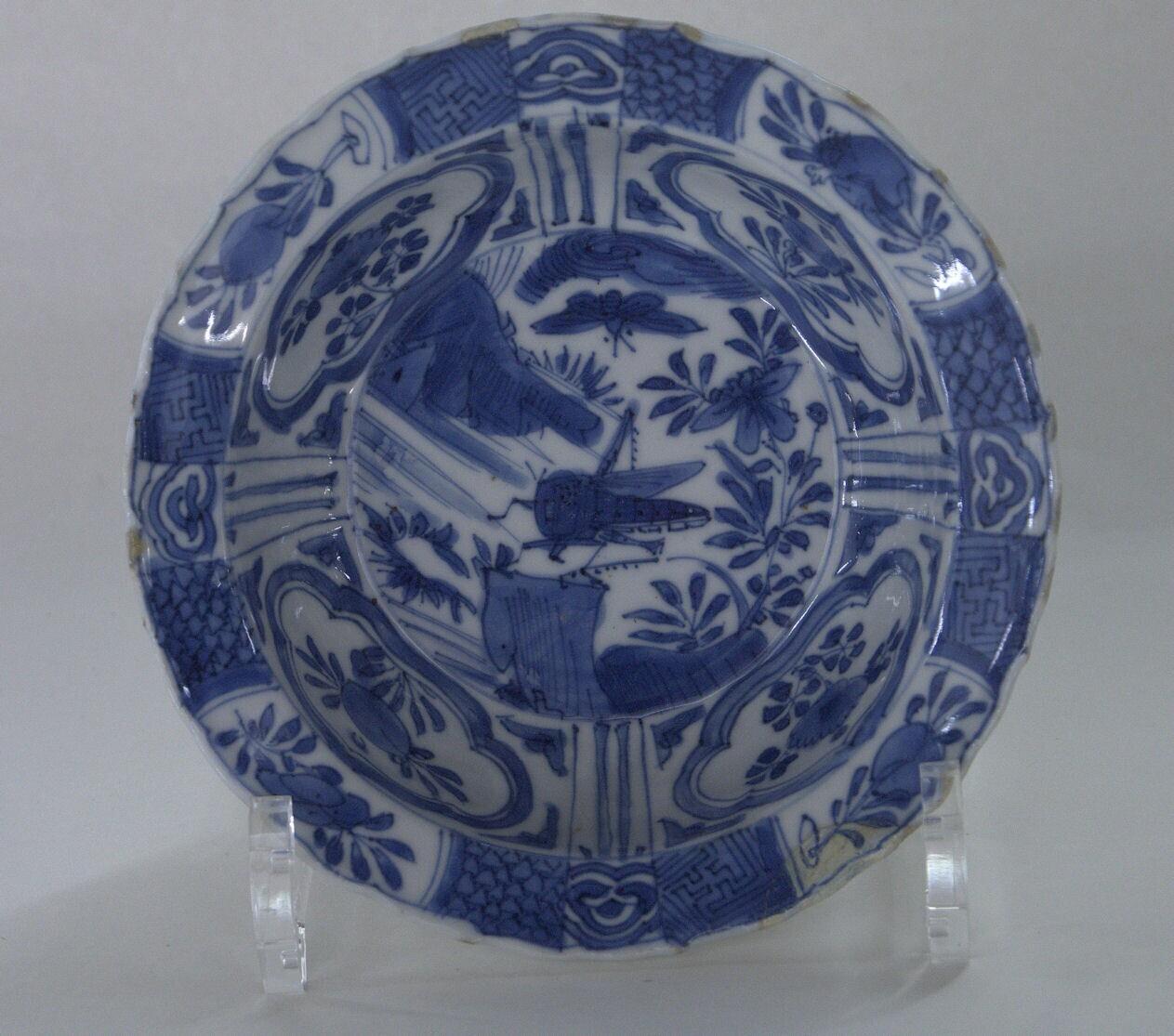 De met standring uitgevoerde klapmuts is aan de buitenkant voorzien van panelen met cartouches gevuld met de brandende parel. De naar buitengeboden geschulpte rand is versierd met diverse soorten servetwerk onderbroken door vier cartouches met perzikbloesem en ruyi's. Aan de binnenkant is in het plat een sprinkhaan afgebeeld op een rots aan de oever van een rivier en een vlinder in de lucht. Op de wand zijn vier cartouches met bloemen, die worden gescheiden door lineaire panelen. Het geheel is uitgevoerd in de Kraakstijl. De kom is gedrukt half-ellipsoïdische van vorm en heeft een standring en een schuin oplopende, geaccoleerde rand, een zogenoemde klapmuts(kom). Het plat heeft, binnen een enkele cirkel, een decor van een rivierlandschap met wolken, een vlinder, rotsen, bloeiende planten en een sprinkhaan op een rots. De wand is versierd met vier lotusvormige cartouches met afwisselende (perzik)bloemdecors. Tussen de lotusvormige cartouches bevinden zich smalle panelen met afhangend strikwerk. De rand is gedecoreerd met afwisselend ru-yi-koppen en ovale cartouches met perzikbloemen, waartussen zich schub- en swastikavormig servetwerk bevindt. De buitenwand is afwisselend versie... (Nederlands)