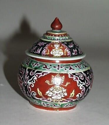 Potje met deksel, voor Siam (Thailand) bestemd. Oosterse of Indische, religieuze afbeeldingen en ornamentale versieringen. Polychroom (ijzerrood en kleurige emaillen) opglazuur. Indische of Oosterse religieuze afbeeldingen en ornamentale versieringen. Dit type porselein wordt 'Bencharong' genoemd. (Nederlands)