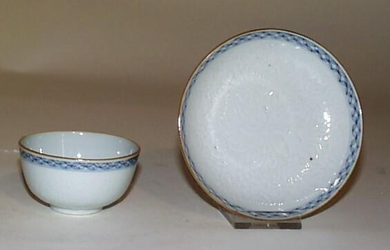 Uitgesneden ornamentaal decor van bloemmotieven, ornamentale rand in blauw onderglazuur, koffiebruine bies op de rand. (Nederlands)