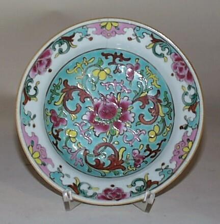 Porselein. Floralistisch en ornamentaal decor opglazuur (donkerbruine trek, ijzerrood en emailkleuren, fondkleur op spiegel lichtblauwig groen. Lichtbruine bies op de rand. (Nederlands)