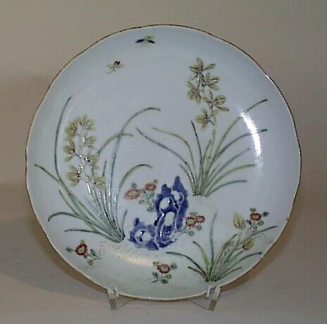 Gegolfde rand. Polychroom decor van bloeiende planten en insecten opglazuur (donkerbruine trek, ijzerrood en emailkleuren). Gouden biesje op de rand. (Nederlands)