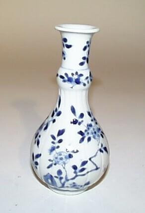 Het vaasje is druppelvormig en geribd en heeft een standring, een buitenwaards gebogen monding en een verbreding in de hals. Een dergelijk vaasje wordt ook wel 'knobbelvaasje' genoemd. De buik is gedecoreerd met rotsen en bloeiende prunus. De halsverbreding en het bovenste deel van de hals hebben een decor van bloemen. (Nederlands)
