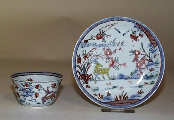 Decor: landschap met kraanvogel, overdecoratie in Holland, ter aanvulling van Chinees decor. Blauw decor onderglazuur (landschap met herten etc.) Overdecoratie opglazuur in Holland (ijzerrode, gele en groene (emaillen) in zwart en goud). Ter aanvulling van Chinees decor. (Nederlands)
