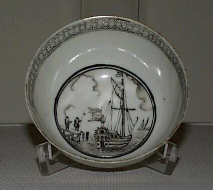 De theekom is convex-conisch van vorm en heeft een standring. Het plat heeft, binnen een dubbele cirkel, een decor van een bewolkt zeegat met zeilschip in de verte, en twee Hollanders, waarvan een met een vlaggetje, op een steiger bij een eenmaster met gestreken zeilen. Langs de rand loopt een band met servetwerk. De buitenwand is gedecoreerd met een uitkijkpost met torentje, rotsen, planten en drie Hollanders, waarvan een met een verrekijker en twee met een pijp, met uitzicht op twee handelsschepen en een jacht. (Nederlands)